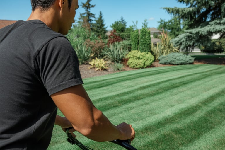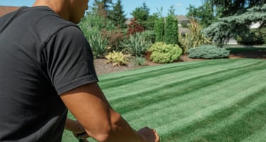 Lawn care and trimming — green grass with a lawnmower silhouette.